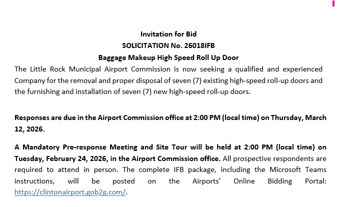 The Little Rock Municipal Airport Commission is pleased to invite Companies to participate in Solicitation 26018IFB Baggage Makeup High Speed Roll Up Doors. All solicitation details, requirements, and submission instructions are available on our Online Bidding & Supplier Portal: https://clintonairport.gob2g.com/. Should you have any questions or require support accessing the portal, please do not hesitate to contact us at procurement@clintonairport.com. Thank you for your interest, and we look forward to your participation.